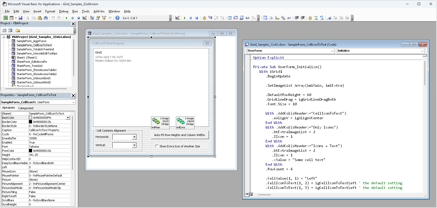 As mentioned in the overview of the 10Tec version of vbAccelerator ImageList Control, there are two editions of this control — Classic Edition and Modern Edition. Classic Edition was compiled with Visual Basic 6 that can generate only 32-bit OCX files. Modern Edition was developed in twinBASIC that can generate 32-bit and 64-bit executable code, and this edition of our ImageList control is provided in two OCX files for the 32-bit and 64-bit CPU architectures. As such, the Modern Edition of 10Tec ImageList Control can be used to develop true 64-bit applications. The screenshot below is an example demonstrating how our 64-bit ImageList OCX is used on a VBA UserForm in 64-bit Microsoft Office: