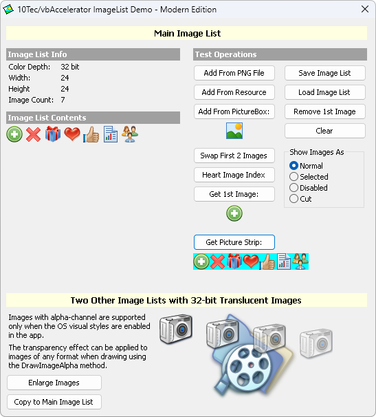 vbAccelerator ImageList OCX, originally developed by Steve McMahon, is an advanced ImageList component that can be used instead of the standard ImageList from the Microsoft Common Controls pack supplied with Visual Basic 5/6. It supports more file formats, image transparency, 24- and 32-bit images and provides useful methods not available in the standard ImageList control.